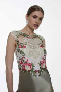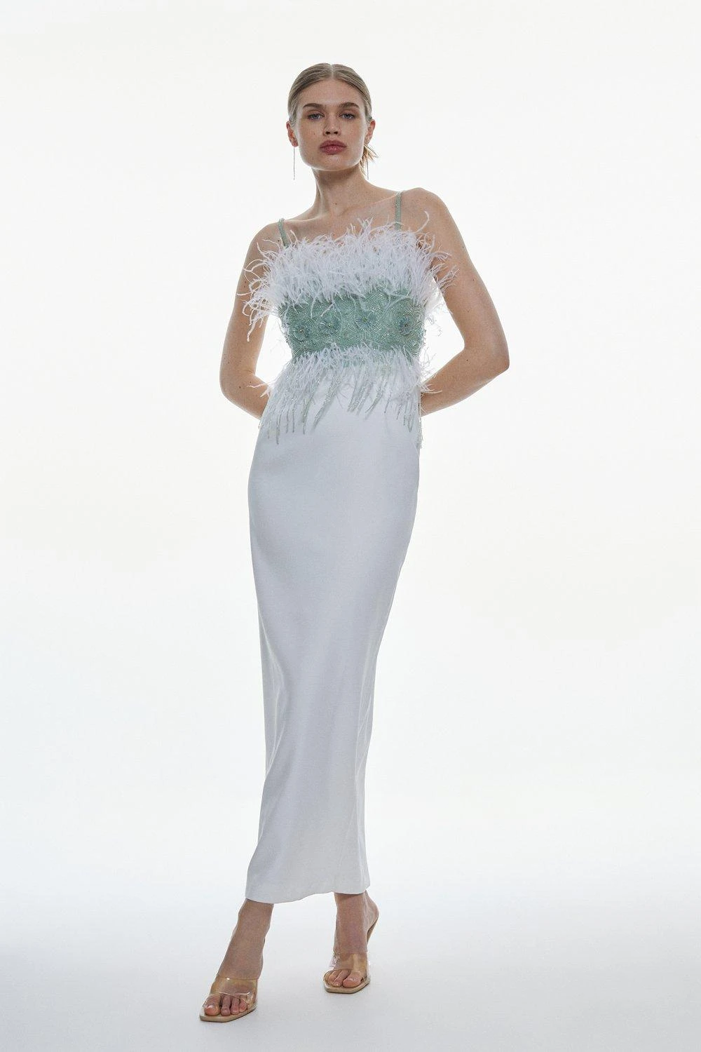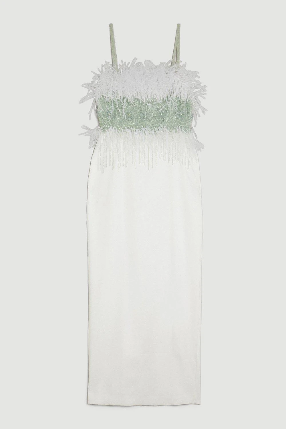 This intricate dress is adorned with vivacious feathers, lending statement-making appeal to this simple silhouette. The bodice is adorned with beaded embellishments and fringe tassels for a glamorous edge. Style this maxi dress with pared-back accessories and let the dress speak for itself.
