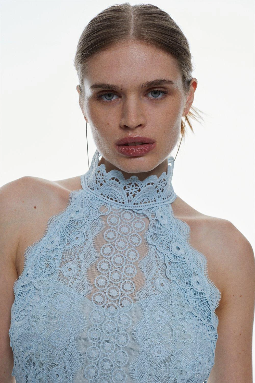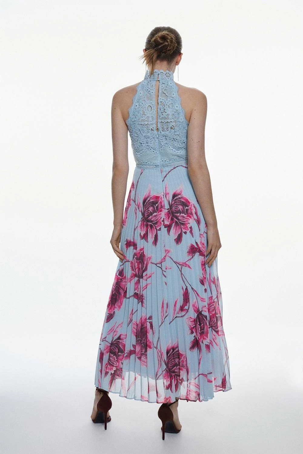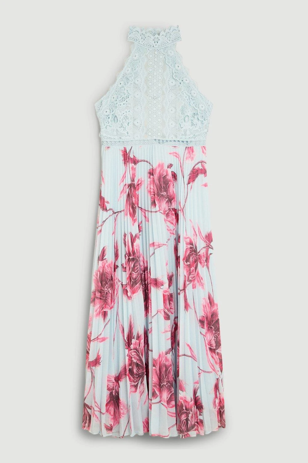 This elegant piece is designed with luxurious guipure lace. Soft pleats fall down to a midi hemline, perfectly tailored to create an elegant glide. A high neckline adds a sophisticated touch, while a floral print ensures feminine appeal.