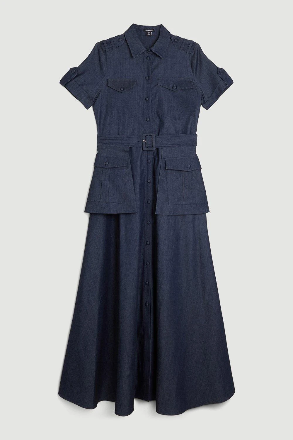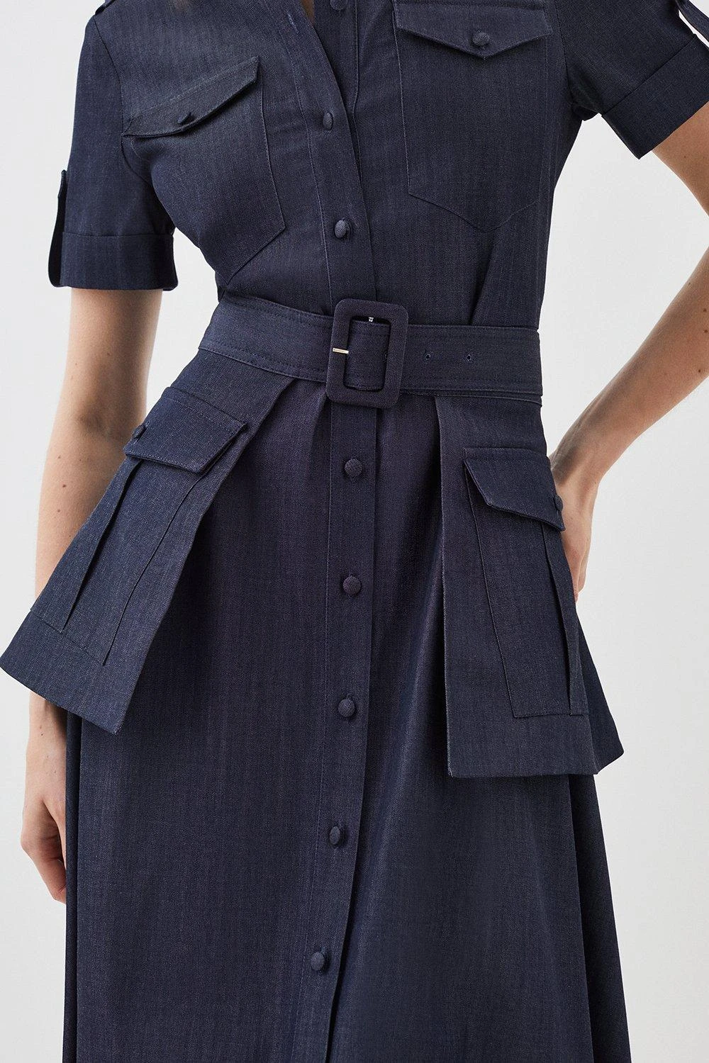 Demonstrate a penchant for directional dressing in this utility shirt dress. This piece is crafted with denim for a fashion-forward update on the classic silhouette. Exaggerated flap pockets add a touch of drama, while a buckle belt subtly cinches the waist.
