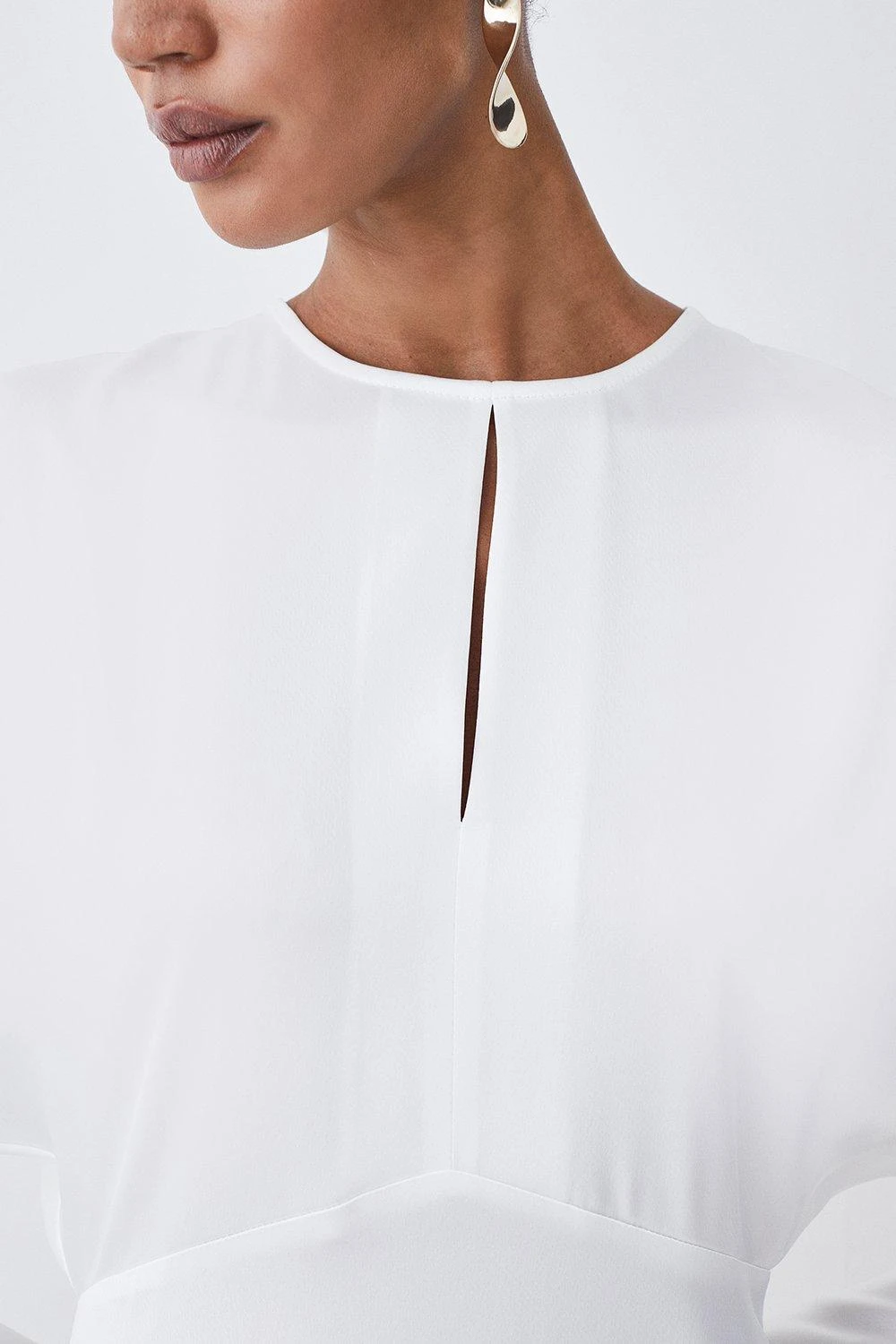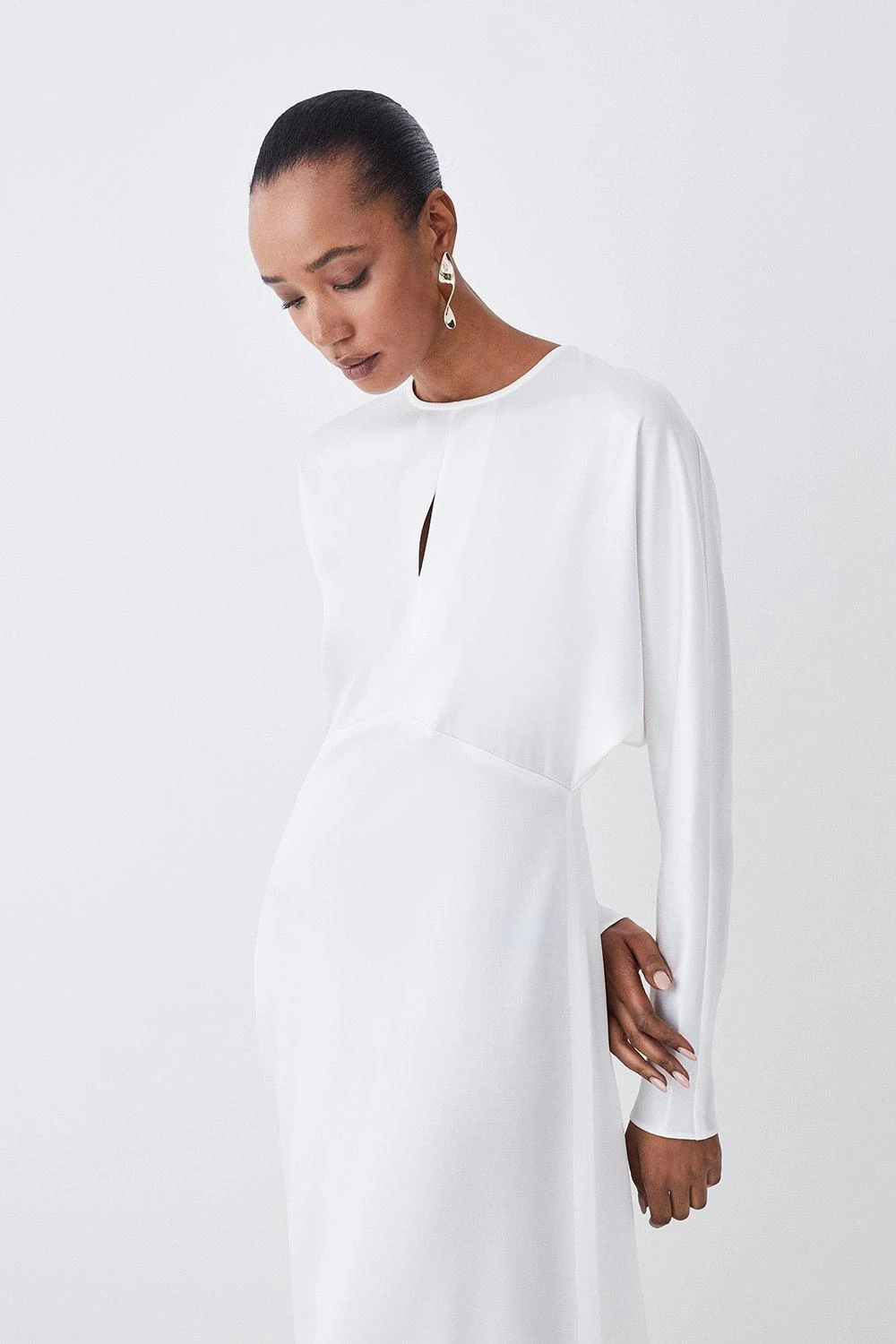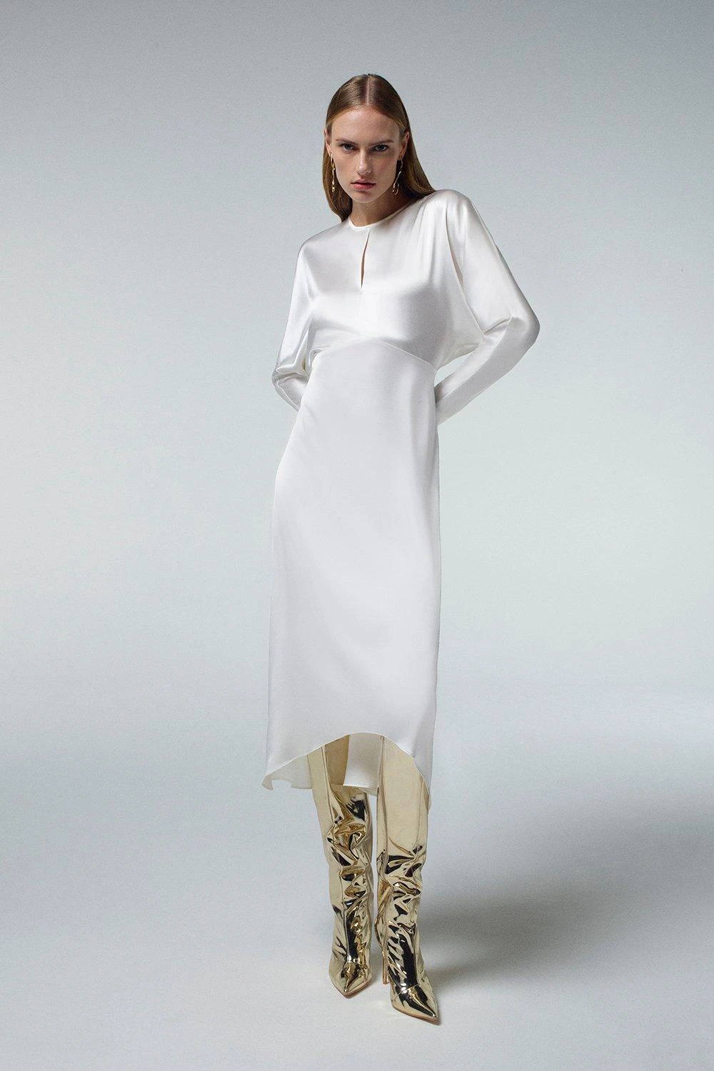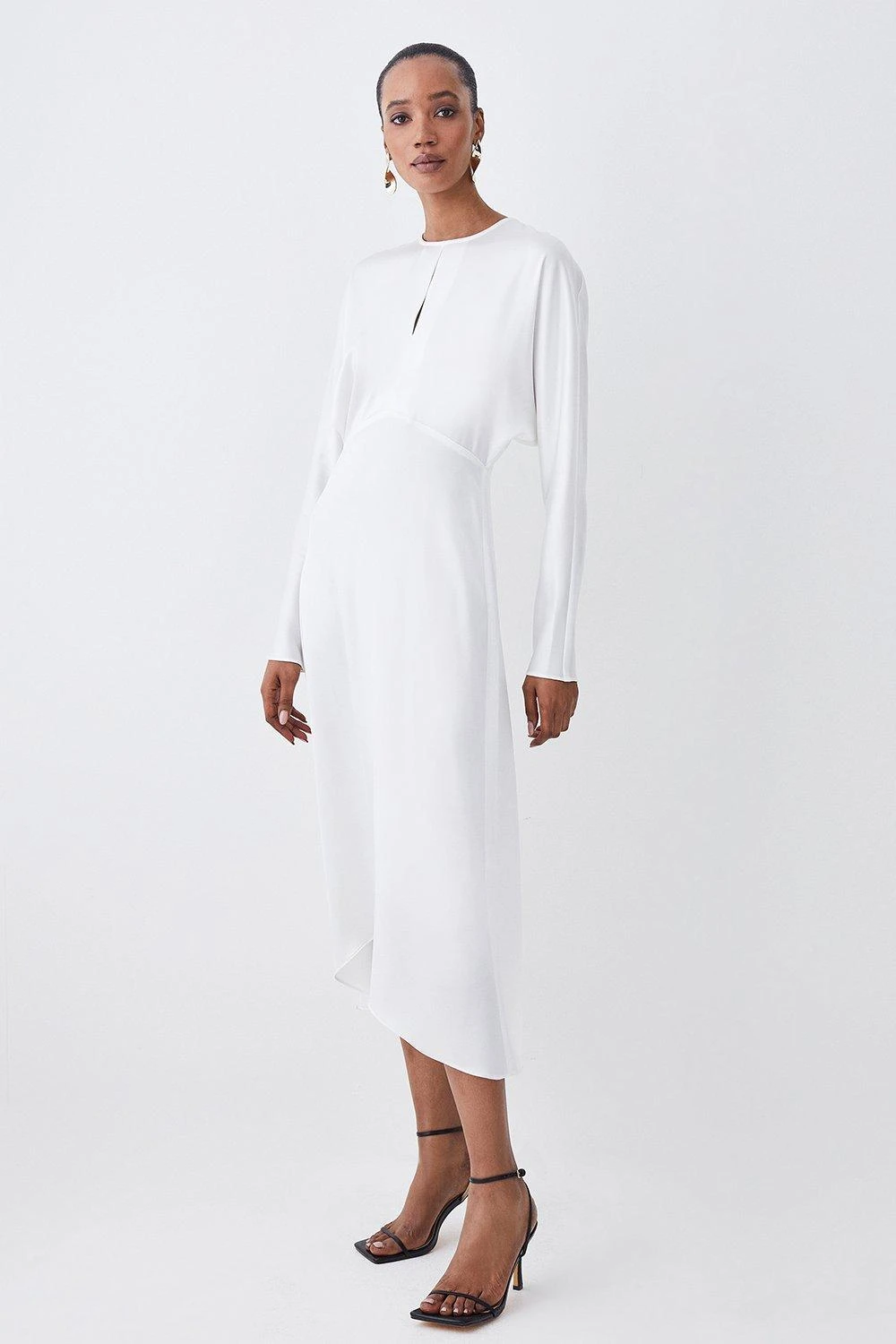 A harmonious blend of elegance and simplicity, this premium midi dress is a testament to timeless style. Lightweight material showcases a luxurious sheen and effortlessly cascades down to a midi hemline, creating a fluid silhouette. Style this dress with strappy heels for a sophisticated ensemble.